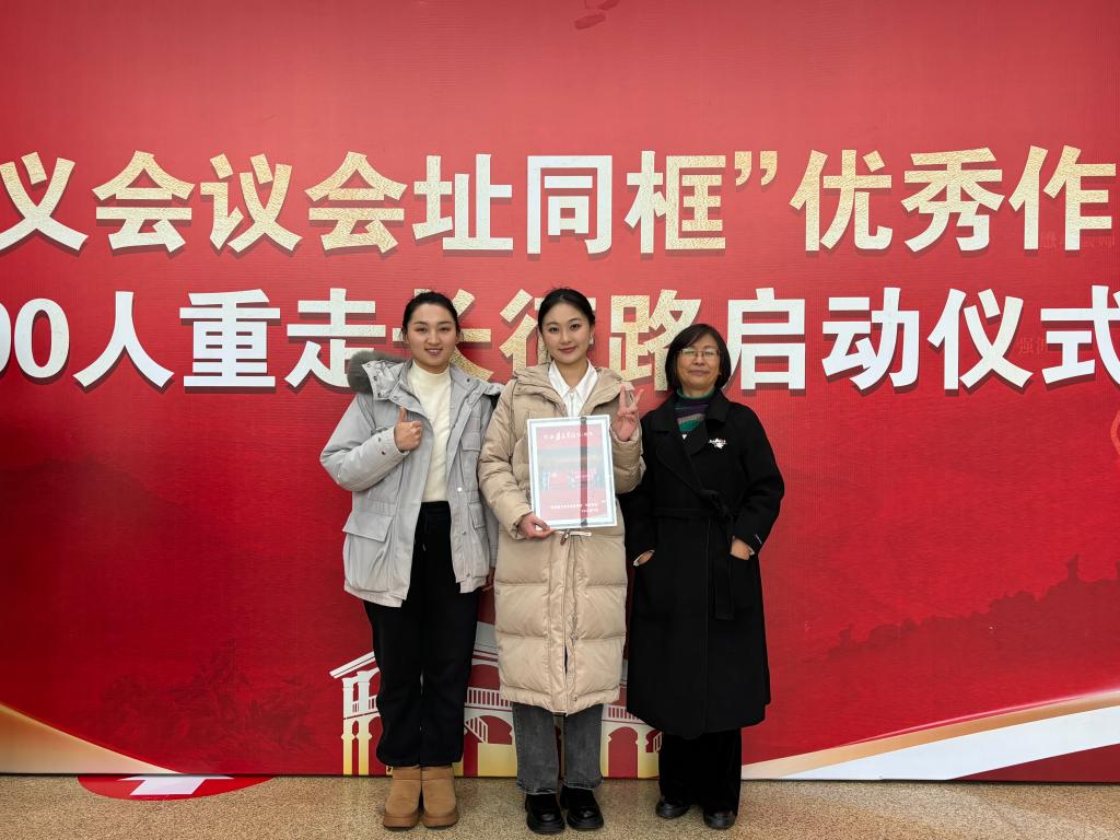 近日,学校选送作品“传承红色基因 走好新时代的长征路”在遵义市委网信办举办的“我与遵义会议会址同框”活动中获奖,学生余冰冰代表团队参加了颁奖活动并现场进行展演。