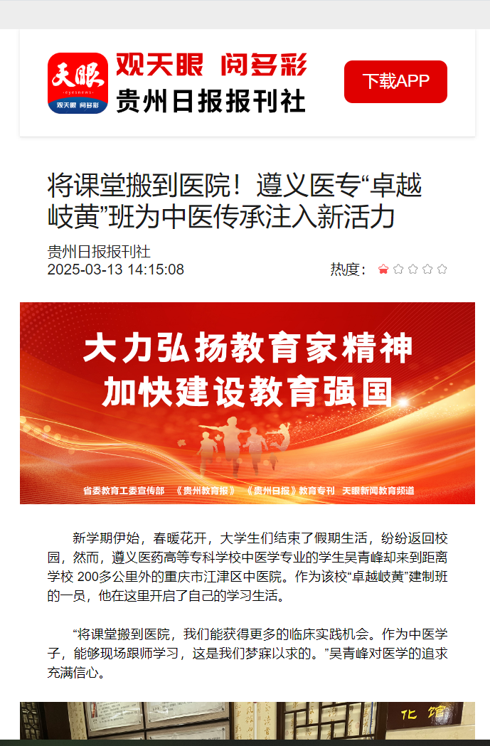 3月13日,贵州日报报刊社天眼新闻客户端报道了我校医教融合人才培养成效。原文如下: