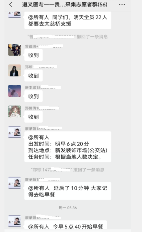 9月中旬以来,我校在贵阳南明区的22名护理专业实习学生在贵阳市南明区卫生健康局的统一调度下,每天按要求奔赴到相应辖区或单位认真完成核酸采集相关工作任务。同学们充分发挥专业特长,牢记学校“勤学敏思、精业济世”校训,用自觉诠释了“白衣天使”的大爱奉献,用行动践行了“红医精神”的责任担当,在工作中充分展现了遵义医专人能吃苦、能战斗、有担当的精神风貌,为打赢贵阳疫情防控攻坚战贡献了遵义医专人的力量。