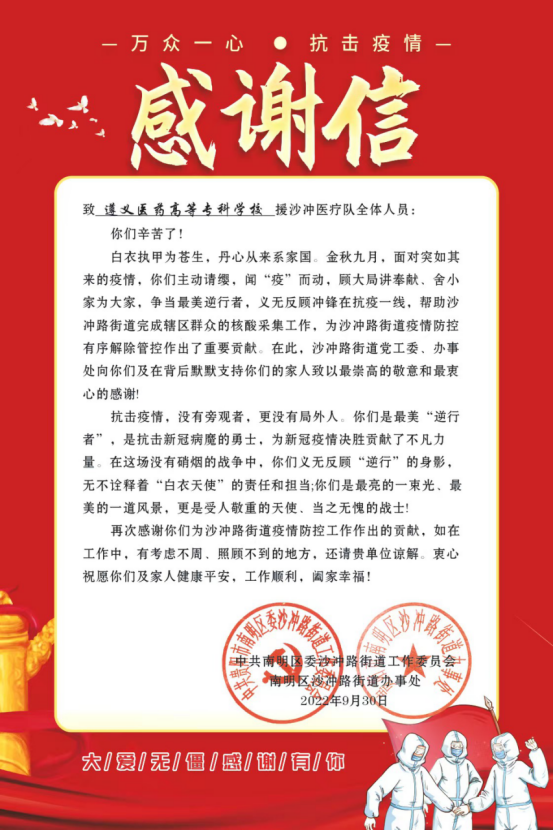 2022年9月末,学校收到一封来自贵阳市南明区沙冲路街道办事处的一封感谢信,信中对我校支援沙冲路街道抗疫的全体同学表达了感谢和赞赏。