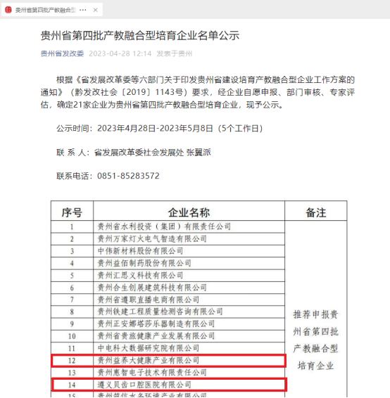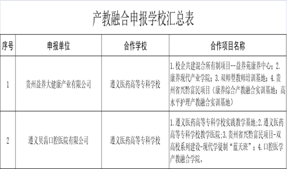 近日,贵州省发改委公布了第四批产教融合型培育企业名单,我校助力贵州益养大健康产业有限公司和遵义贝齿口腔医院有限公司2家深度合作企业入选省产教融合型培育企业。这是我校不断优化校企协同育人和协同创新机制,高水平推进产教深度融合所取得的产教融合标志性成果。