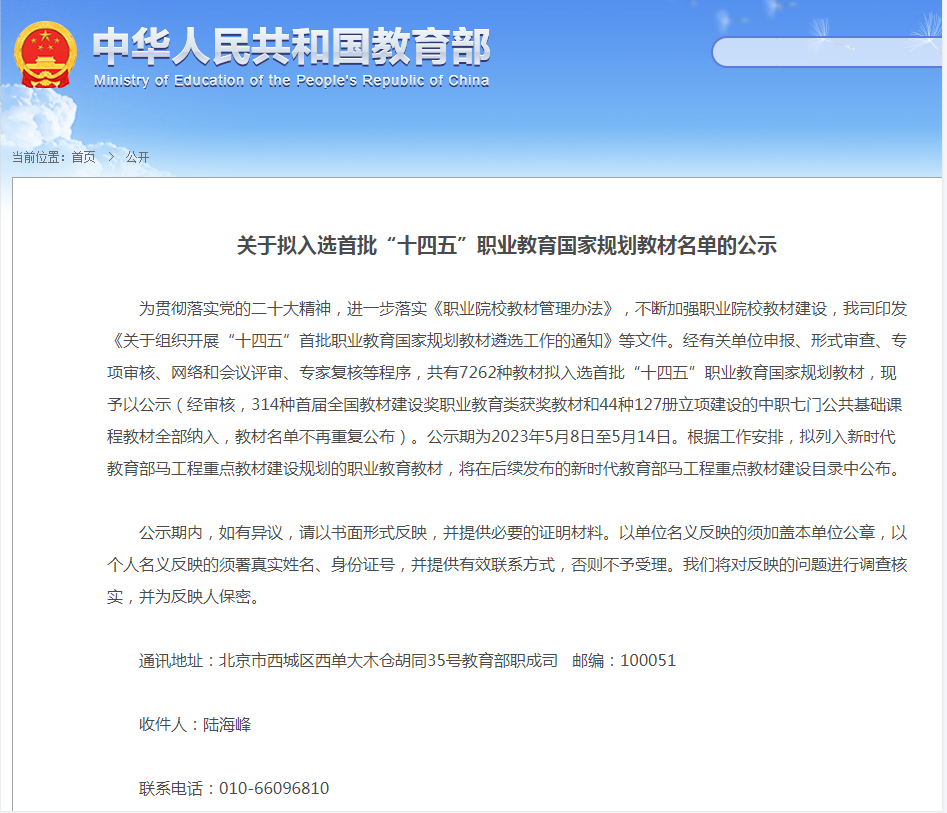 近日,教育部发布了《关于拟入选首批“十四五”职业教育国家规划教材名单的公示》,我校1部首届全国教材建设奖职业教育类获奖教材、2部“十三五”职业教育国家规划教材及1部新申报教材入选。(名单如下)