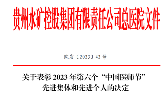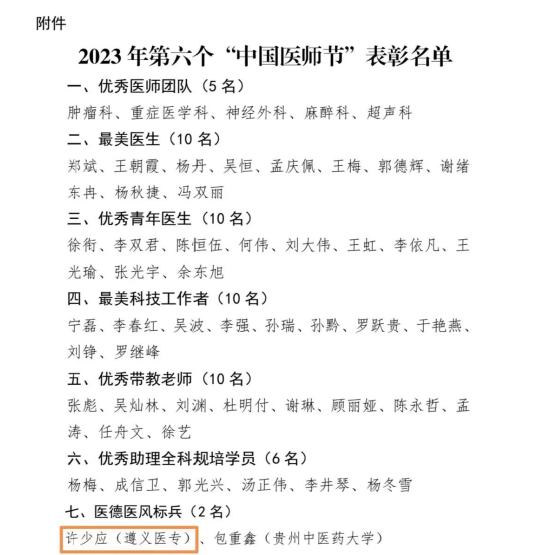 近日,我校2021级康复治疗技术专业许少应同学被贵州水矿控股集团有限责任公司总医院在2023年“中国医师节”授予“医德医风标兵”荣誉称号。