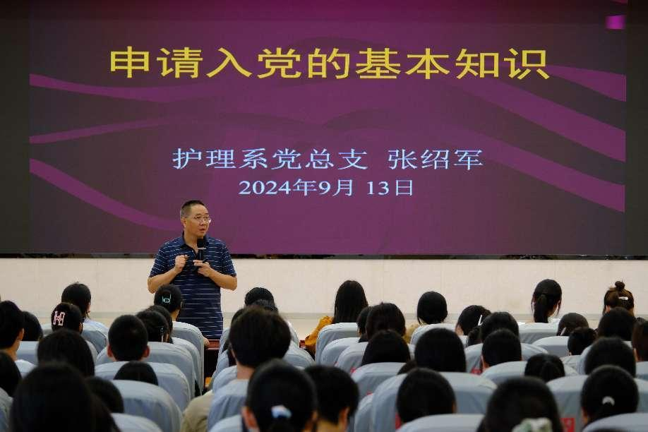 9月13日,护理系党总支书记张绍军面向2024级新生开展入党启蒙教育,2024级各班班长、团支书及学生代表参加学习。