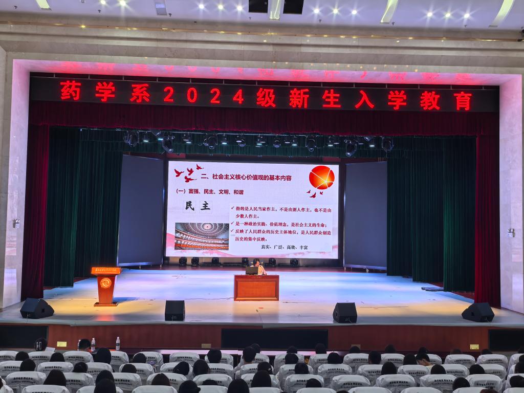 药学系党总支书记陈一代表药学系全体师生对2024级新生的到来表示热烈欢迎。以“人民有信仰,国家有力量,民族有希望—培育和践行社会主义核心价值观”为题为新生讲授“开学第一堂思政课”,引经据典、旁征博引,从社会主义核心价值观的基本内容、重要意义等方面向同学们进行了介绍,并希望新生一是要勤学,下苦功夫,求真学问;二是修德,加强道德修养,注重道德实践;三是要明辩,辨是非,善决断;四是笃实,扎实干事,踏实做人。