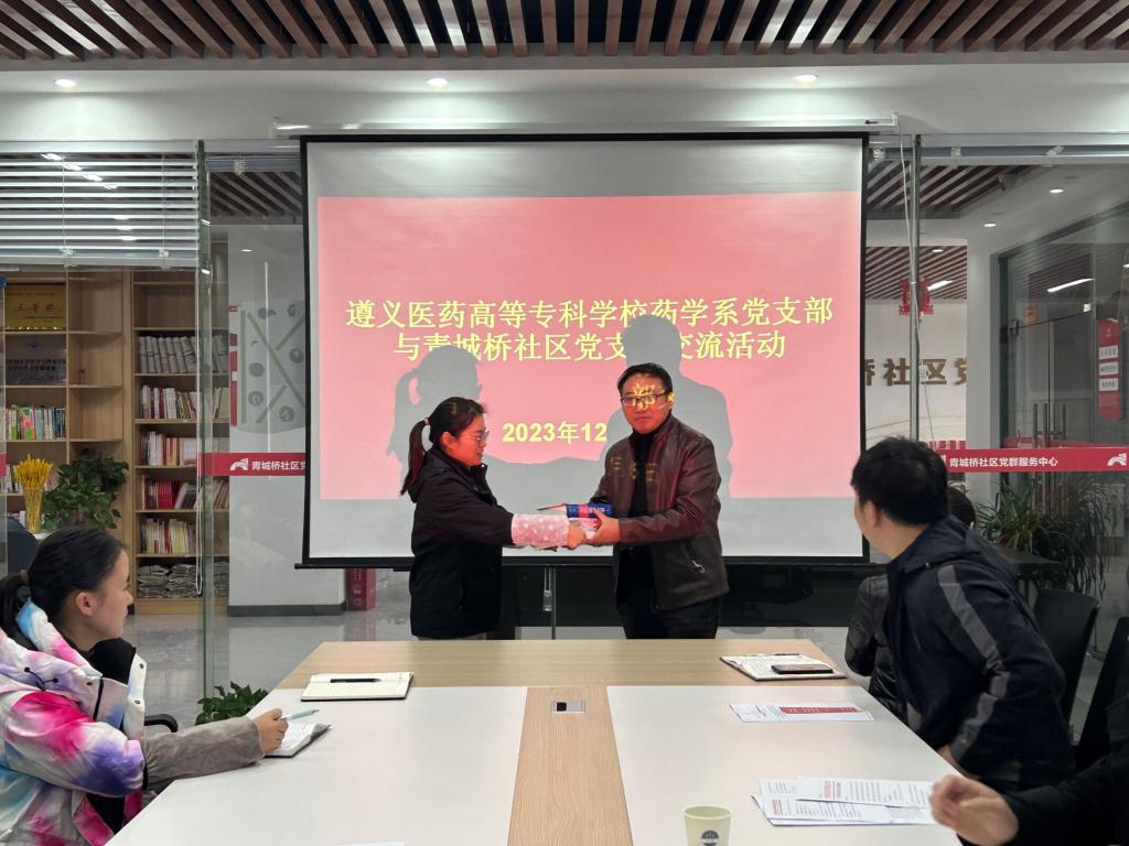 随后,药学系党支部与青城桥社区党支部开展了党建工作交流座谈会。双方就党员如何服务社区、服务群众、服务基层,如何让群众感受到党员同志的先锋模范作用和党组织全心全意为人民服务初心使命以及今后为群众服务事项等进行深度交流。同时,向青城桥社区党支部赠送了家庭用药书籍12套。