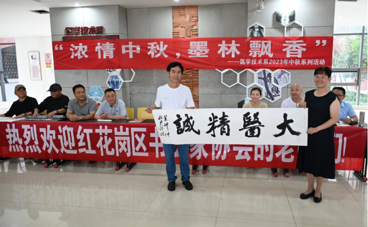 活动中,书画家们现场泼墨挥毫,题写中秋、国庆祝福语和对大学生的期望,并向医学技术系赠送墨宝。参加活动的师生们在书画区域虚心向书画老师们学习书画技巧,现场气氛活跃。活动中师生们还品尝了月饼、DIY中秋节灯笼、书写中秋、国庆祝福卡片,活动让同学们感受到中国传统节日的魅力,热闹的节日气氛融入师生们的心田。