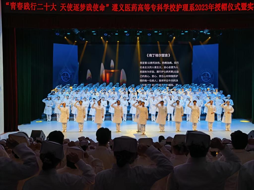 活动最后,在柔和的灯光和舒缓的音乐中,罗仕蓉等10名教师为即将走向工作岗位的准护士授帽。一袭飘然的白衣是一颗纯洁的心灵,一顶别致的燕帽是一项守护生命的重任。同学们接过前辈手中燃烧的红烛,立志在平凡的护理工作中,用精湛的技术、天使的爱心,为生命注入永恒的光芒和希望。授帽仪式结束后,全体护生举起右手,庄严宣誓,郑重承诺将永葆初心,胸怀崇高职业理想,将开拓和发展护理事业作为己任,为人类的健康事业作出贡献。
