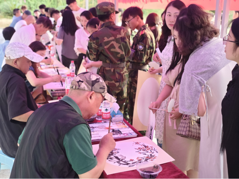 活动中“笔墨书盛世”环节,邀请了书画家进行现场书画展示,他们用笔墨描绘祖国的锦绣山河和对祖国的美好愿景,展现了高超的艺术水准。同时,书画家们还指导部分同学进行书画创作,让同学们在墨香中感受传统文化的魅力。非遗漆扇制作环节也吸引了众多同学参与。同学们在领略非物质文化遗产魅力的同时,深入了解中华优秀传统文化的深邃内涵。通过亲手制作漆扇,他们对传承传统文化有了更深刻的体验。