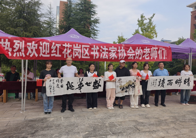 活动现场,节日的欢腾与文化的醇香交织成一幅绚烂画卷。师生们以笔为舟,以墨为海,遨游于传统书画的浩瀚之中,每一笔每一划皆是对祖国盛世最深情的颂歌,绘就了心灵的洗礼与文化的盛宴,洋溢着对这片土地无尽的热爱与崇高敬意。