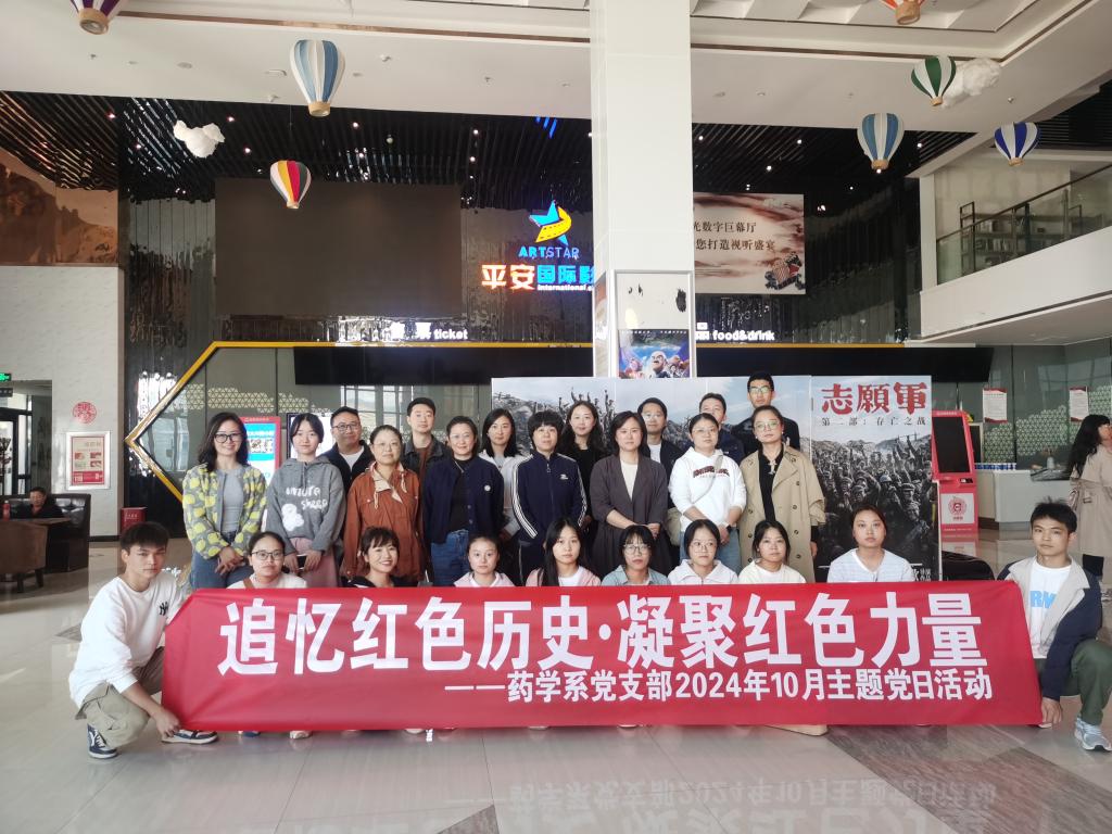 为进一步激励党员同志坚定理想信念,传承红色基因,赓续红色血脉,弘扬爱国主义精神,增强党员的凝聚力和战斗力,10月17日,药学系党支部组织全体党员同志在平安国际电影城开展“追忆红色历史 凝聚红色力量”红色观影主题党日活动。师生党员等30人参加。
