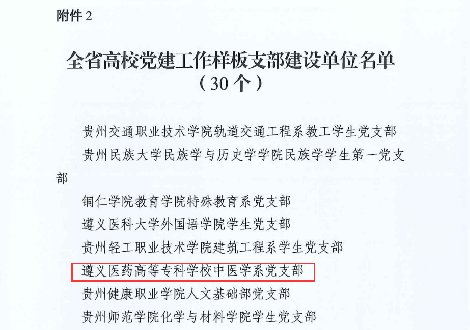 近日,省委教育工委下发了《关于公布“全省高校党建示范点”创建工程和“全省高校党建‘双带头人’”培育工程建设单位名单的通知》,公布了全省高校党建工作标杆院系、全省高校党建工作样板支部建设单位和全省高校“双带头人”教师党支部书记工作室建设单位,我校中医学系党支部荣获全省高校党建工作样板支部建设单位。