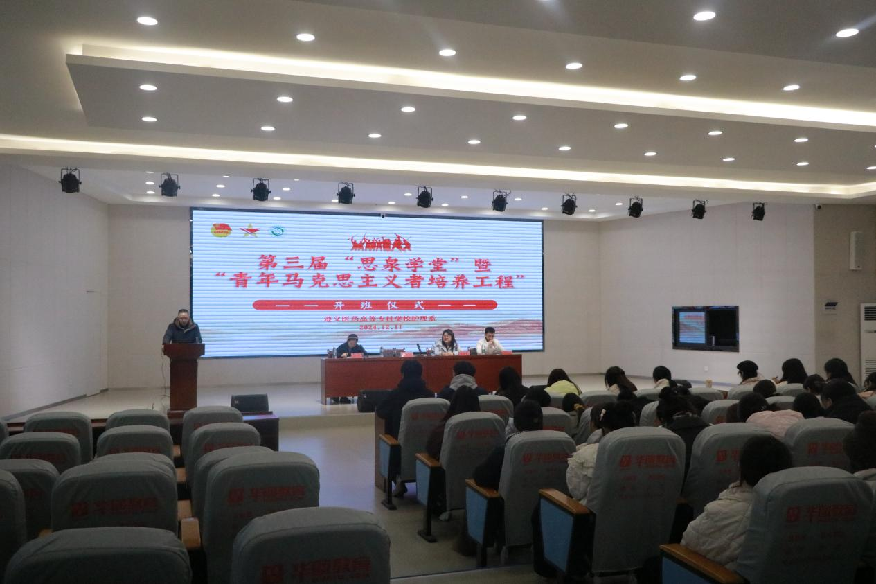 12月11日,护理系第三届“思泉学堂”暨“青年马克思主义者培养工程”开班仪式在护理系小礼堂举行。护理系党总支书记张绍军、学生工作办公室副主任张金霞、团学指导老师廖骑旗以及100名学员参加开班仪式。仪式由护理系党总支专职组织员李璟主持。